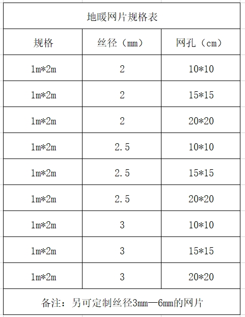 通常使用的地暖網(wǎng)片規(guī)格為絲徑2mm,網(wǎng)孔10cm×10cm,長(zhǎng)寬1m×2m。